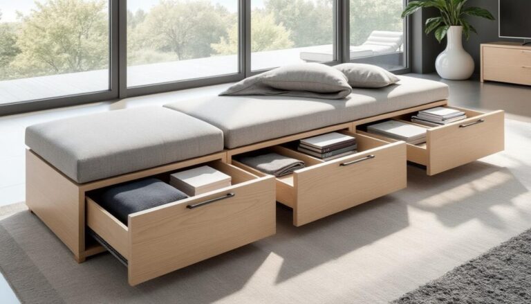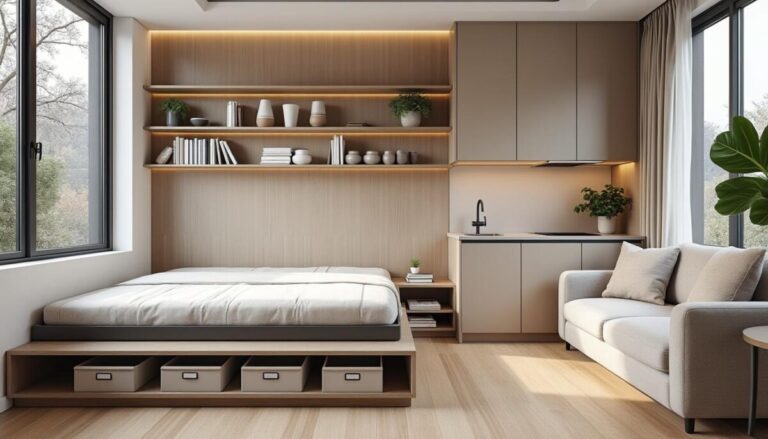 Utilise l’espace vertical avec des étagères murales, sous le lit avec des boîtes plates, et investis dans des meubles multifonctions comme les lits avec rangements intégrés.